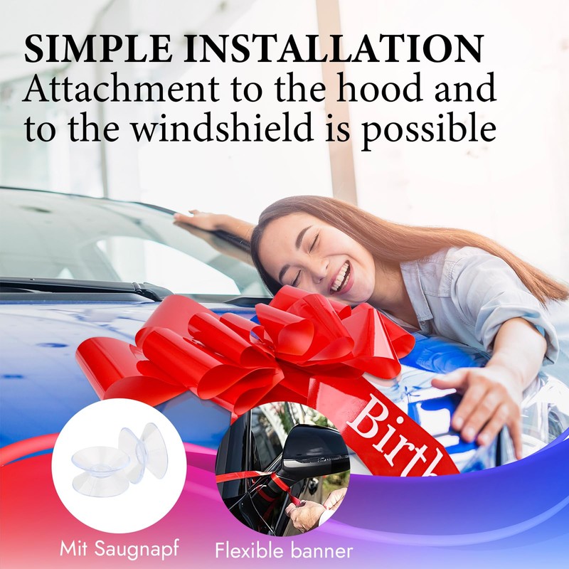 - Easy installation: the large red car bow comes in a rolled shape. With just a few simple steps, it can be pulled together into a giant gift bow. Equipped with suction cups and extra long ribbons, it can be easily attached to any gift.