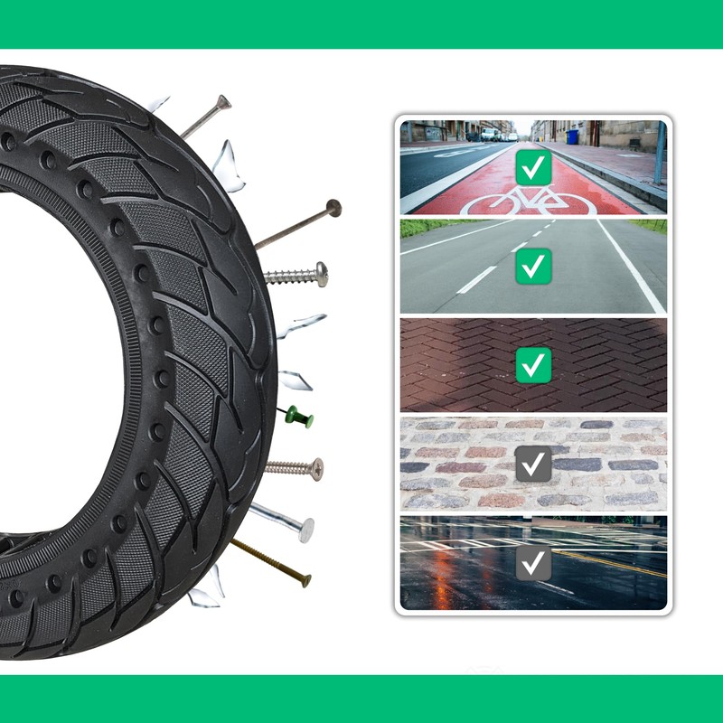 - 🛞 SOLID TIRE 10X2.125 ●● These 10x2.125-inch tires are specially designed for a wide range of electric scooters. They are compatible with wheels with an inner diameter of 13.7cm. The total outer diameter is 10 inches. The tire width is 2.125 inches, explaining the dimensions marked on the tire.