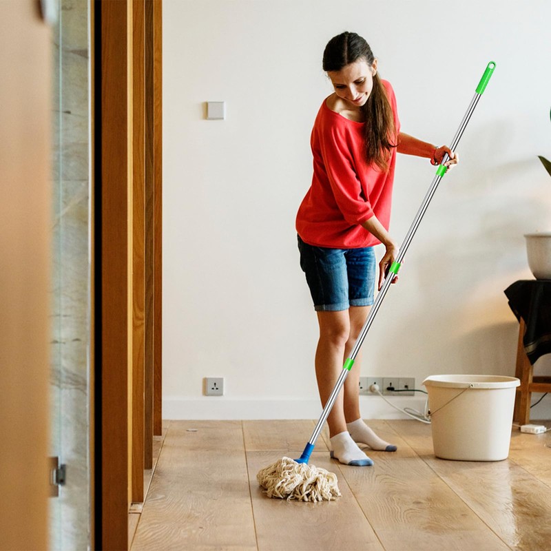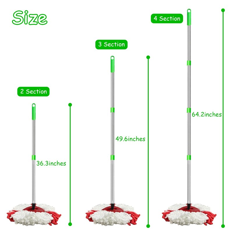 - [Adjustable Length]: The four-section mop handle can be adjusted between 32 and 64 inches, depending on your height.This feature reduces the need to bend over while cleaning, making the cleaning easier and more comfortable.