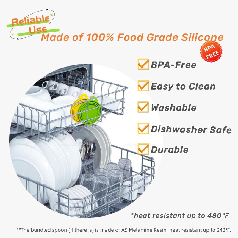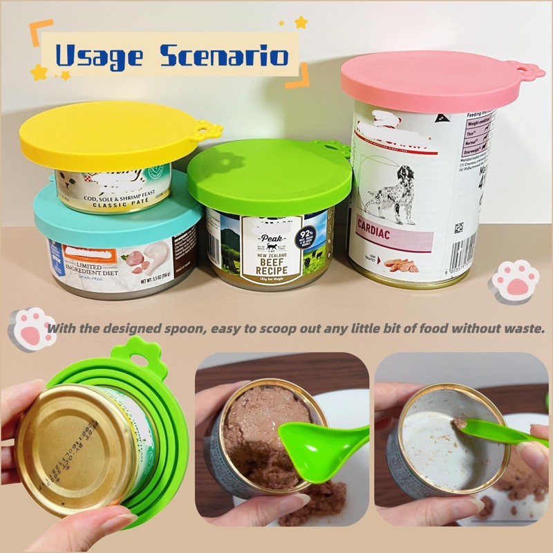 • 2.【Safe Material】These dog food can lids are made of 100% Premium Silicone in food grade, durable and BPA free. This silicone can cover is safe to directly touch foods for both pets and human. Water cleaned and Dishwasher safe.