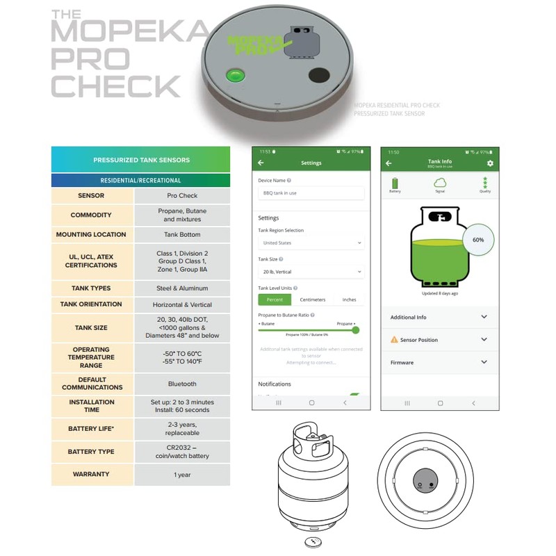 - Latest Model - Mopeka's latest patented ultrasonic sensor, the Pro Check, boasts enhanced reading quality and precision. This propane grill gauge features an integrated temperature sensor, tank "bubble level," configurable sample timing, firmware updates, alarms/alerts, and more. It supports both vertical and horizontal cylinders, making it a versatile option for propane tank monitoring.