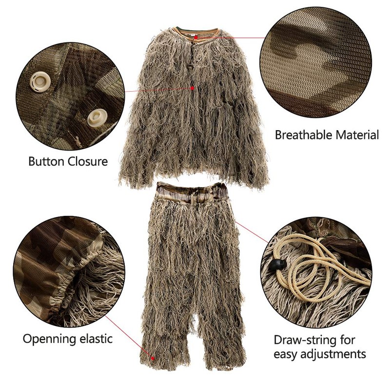 - 【Camouflage Design】Ghillie suit is designed as a protective clothing, as it allows people to blend into outer environment.