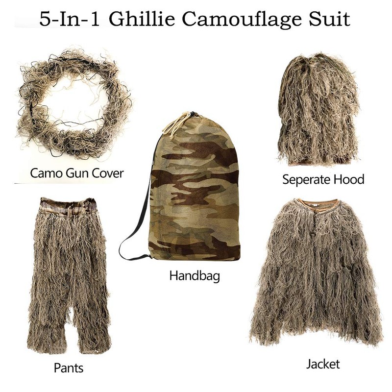- 【Package Includes】 Pack of 5 in 1 Ghillie Suit includes hood, jacket, pants, gun wrap, and a stuff sack. Portable to get it into stuff sack enables to carry.