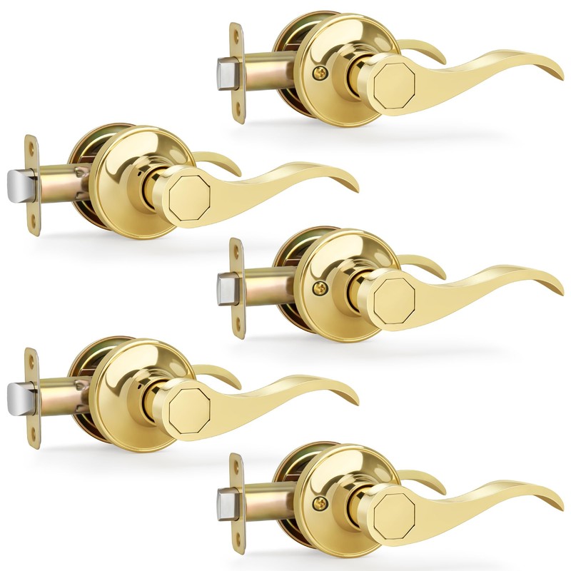 Moquin 5 Pack Wholesale Polished Brass Door Lever, Wave Design Passage Door Lever Without Keys and Lock, Reversible Door Handle for Right/Left Side for Closet/Hallway Door Lock
