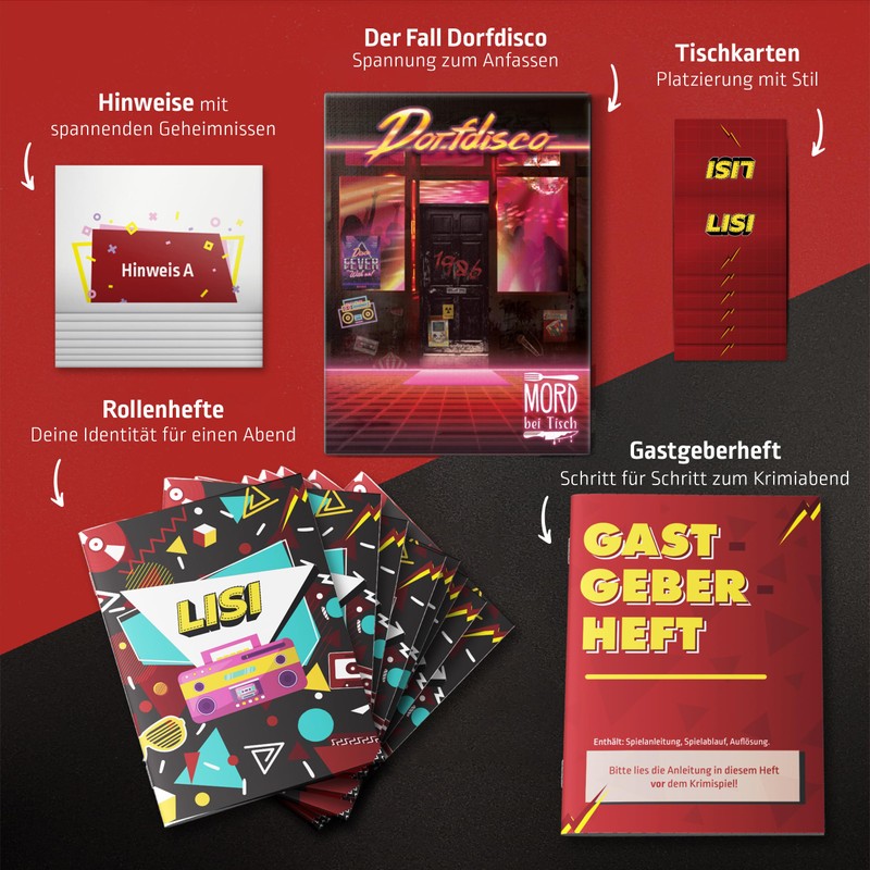 Mord bei Tisch Crime Dinner for Home - 4 to 6 People - The Village Disco Case - The Crime Game from 16 Years - Ideal as a Crime Dinner for a Murderous Dinner Party