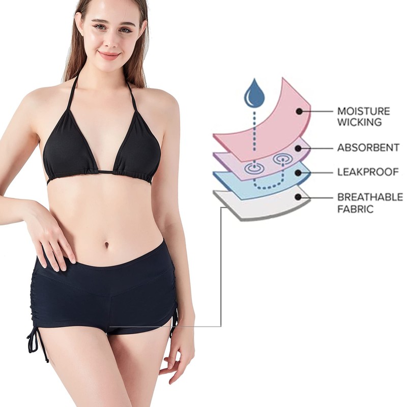 - No requiere tampones: nuestros pantalones cortos de baño de época tienen un forro absorbente integrado que proporciona protección equivalente a hasta 2-3 tampones, eliminando la necesidad de productos menstruales adicionales.