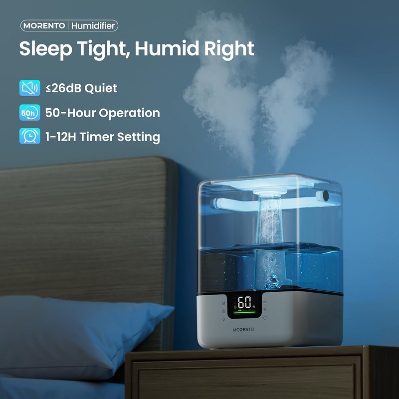 - 6L Large Capacity & Double Nozzle: Enjoy extended use as long as 50H without constant refills thanks to the spacious 6-liter water tank of MORENTO smart humidifiers for bedroom. The innovative double nozzle design provides even distribution, swiftly covering larger rooms and ensuring optimal humidity levels throughout