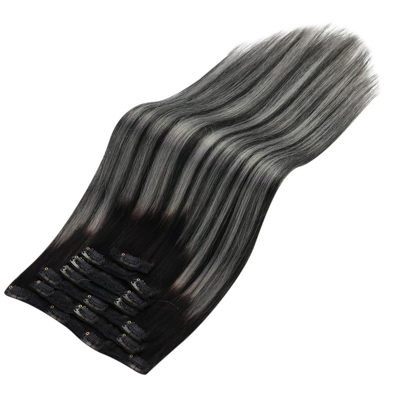 Moresoo Clip-In Real Hair Extensions Black to Silver with Natural Black Real Hair Clips in Extensions Soft Extensions Clips in Real Hair 30 cm 5 Pieces 80 g