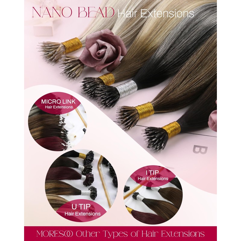 - Premium Nanoring Extensions Human Hair: Only the highest quality Remy hair is used for our Moresoo hair extensions to ensure smooth, soft and seamless integration with your natural hair. Nano beads are smaller and more discreet for a truly natural look.