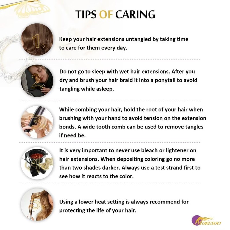 - Care instructions: please wash the hair with a mild shampoo and let it dry naturally. Since hair extensions do not absorb nutrients like our own hair from ourselves, daily care is important: use conditioner and hair mask to moisturise the hair extensions, and use essential oils to protect them.