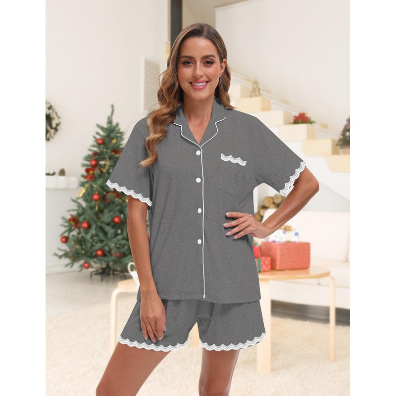 MORFORU Pajamas for Women Set 2 Pcs Lace Short Sleeve Shorts Pjs Button Down Sleepwear Lounge Set with Sleep Mask, Hairband (M) Grey