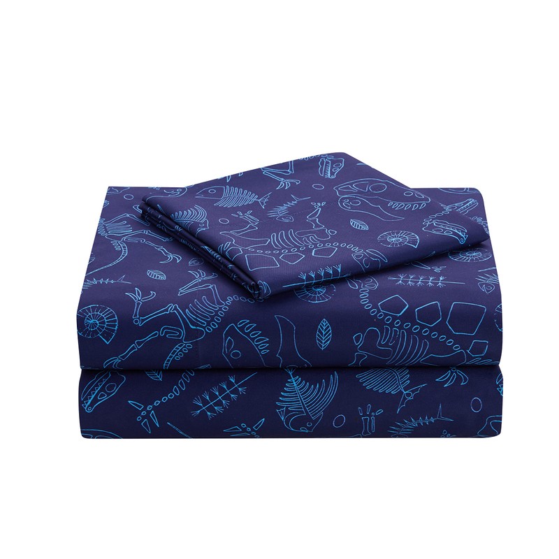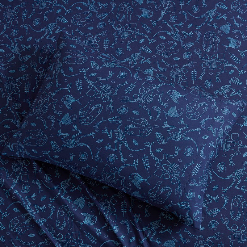 - DINOSAUR DIG: Featuring light blue dinosaur fossils, shells, and vegetation from prehistoric times against a deep navy blue background. Perfect for any future paleontologist, this super cozy sheet set is made of soft, durable microfiber that will keep you warm and cozy all night.
