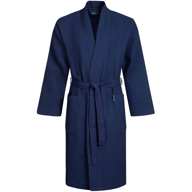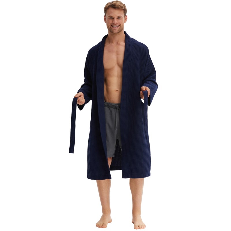 - Soft Morgenstern waffle pique men's bathrobe in navy made of elegant cotton with kimono collar and belt for tightening convinces with pleasant lightness and comfortable fit.