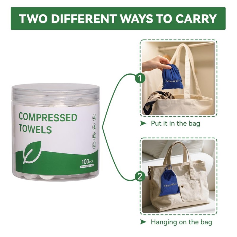 - 【Adventurer's Kit】 Includes 100 compression wipes + #zero-waste drawstring organizer. The organizer bag is machine washable and reusable, meets the standard of outdoor gear, perfect partner for hiking bag/first aid kit/travel kit. PLEASE NOTE: Compressed towels are small and can be a choking hazard! Children under 3 years old need to be supervised by an adult!