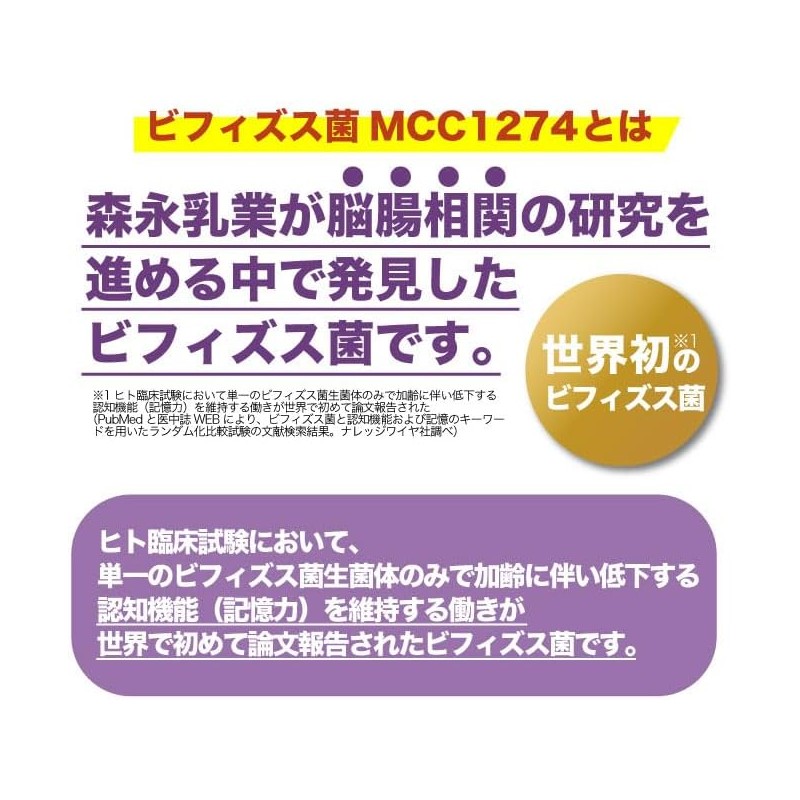 - Formulated with 50 billion Bifidobacteria MCC1274: Bifidobacteria MCC1274 is Bifidobacteria that has discovered by Morinaga Milk Industry. 50 billion sticks are formulated to deliver bifidobacteria to the intestine