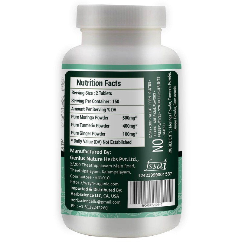 - ππππππ πππππππππ πππ ππππππππ πππππππ - Each Serving has moringa powder 500 mg, Turmeric powder 400 mg and Ginger Powder 100 mg. One Herbal Tablet with Three Benefits.