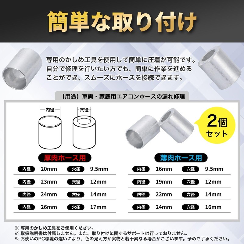 - 【エアコンホース対応】 R12およびR134aに対応したエアコンホースに使用できるカシメスリーブ(カシメキャップ)です。軽量かつ頑丈なアルミニウム素材で作られ、ホース接続をしっかり固定し、冷媒漏れを防ぐことで、エアコンシステムの信頼性を維持します。2個セットで、様々なサイズをご用意しています。