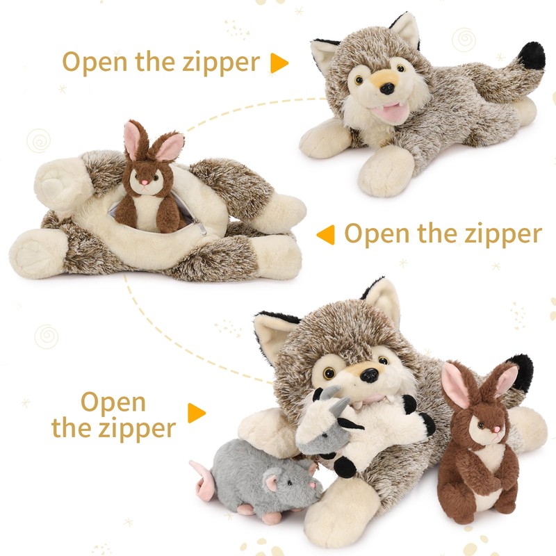 MorisMos 50 cm Long Wolf Cuddly Toy XXL with 3 Babies (Rat Sheep Rabbit), Giant Wolf Cuddly Toy, Large Wolf Plush Toy, Stuffed Toy, Wolf Teddy Birthday Gift for Children