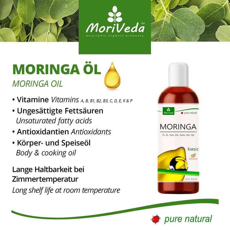 - 100 ml (approx. 88 g) guarantees pure, laboratory-tested Moringa basic oil. High bioavailability.
