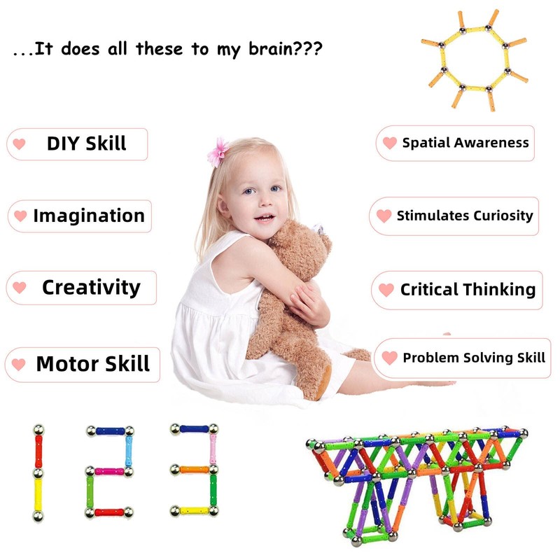 Morkka magnetic toy can stimulate children's potential knowledge in the brain. Recognizing colour and shape, creativity and imagination, motor skills, manipulation, thinking ability and problem solving, ability to build and design develop while playing.