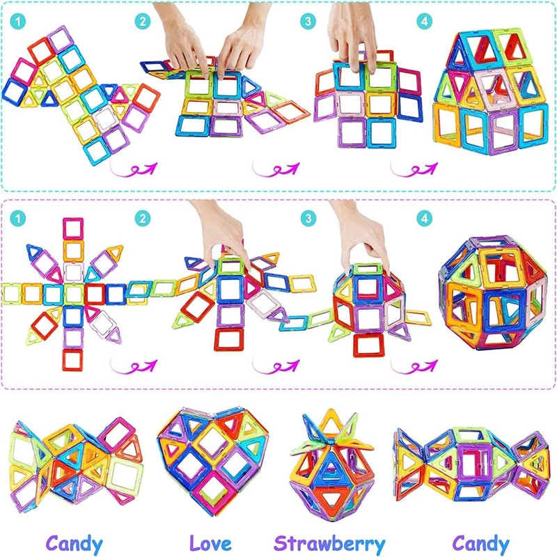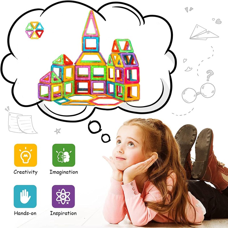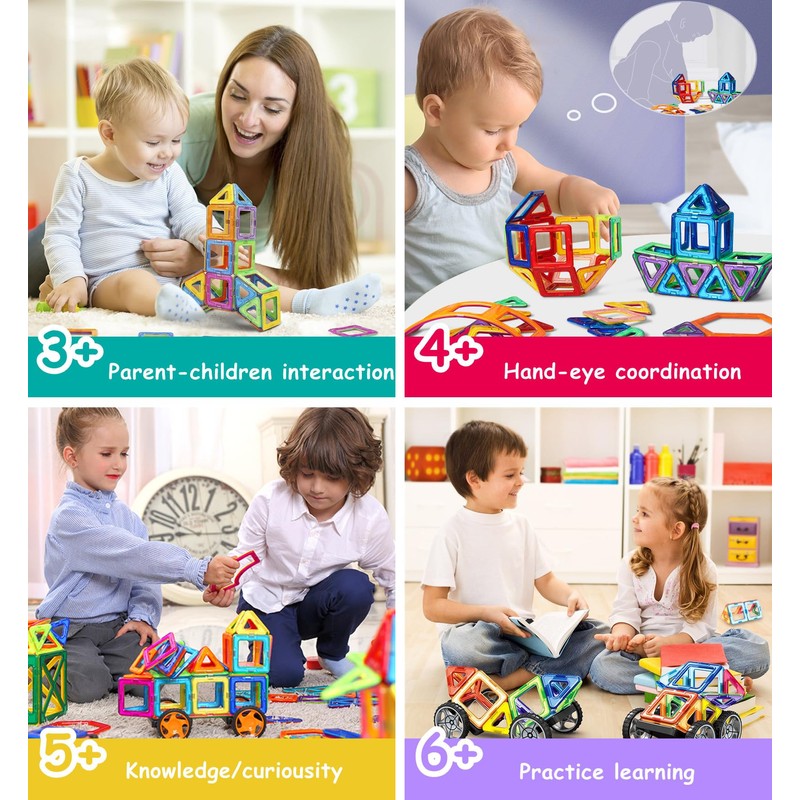 - Educational and creative toddler toys: 64 pieces magnetic blocks toy set, a great creative toy that lets your child engage with their imagination. It is low-tech and produces very little noise. Your child can develop its creative side and motor skills through play, can be combined in many patterns, such as: House, plane, train, cat, fish, ball and more.