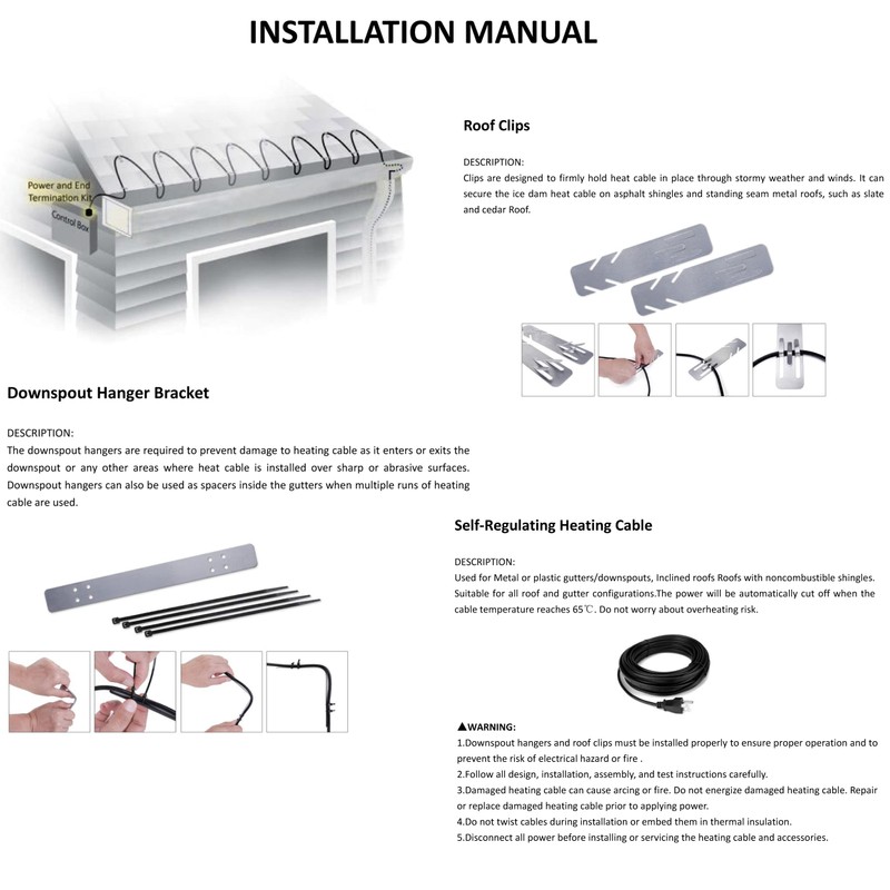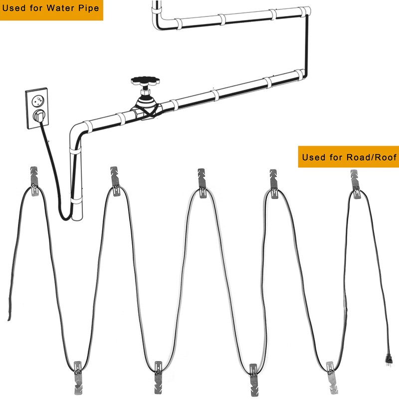 - 【Wide Application】: Our roof heat cable is in Pre-Self-regulating temperature design, energy-saving and safe. It works with most roof and gutter configurations. It is not only used to prevent icing and ice dams on roof, gutters, downspout, road, but also prevent icing on water pipe in metal or plastic, and can used for other DIY heating as well.