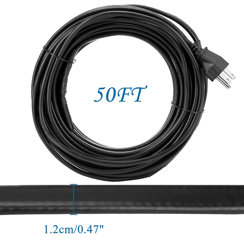 - 【Heat Tape for Water Pipes, Roof and Gutters】: Our 50 feet heat cable in 1.2cm/0.47inch width is suitable for most plastic and metal water pipes. It could prevent pipe burst in winter because pipe thaw after freeze is liable to burst. It could also be used on flat roofs and metal roofs, to prevents melting snow (water) from draining off the roof and protect your roof and gutters from ice dam.