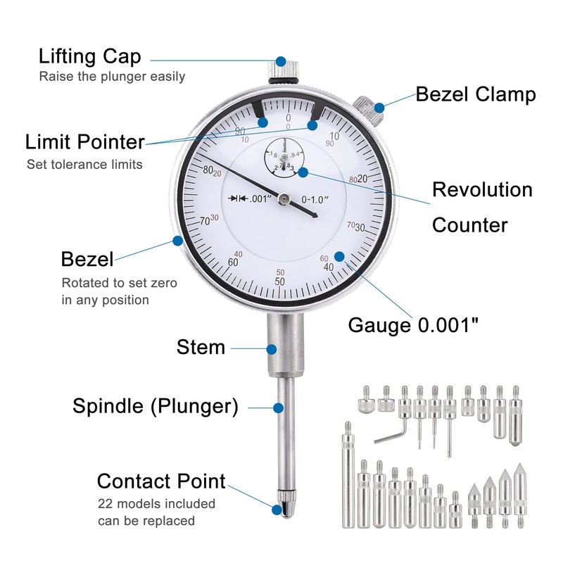 - 【Package Includes】: 1 x 0-1" .001" Dial Indicator, 1 x Magnetic Base Holder, 1 x Orange Hard Plastic Case, 1 x 22-pieces Indicator Points Set. Great Dial Indicator with Magnetic Base and Point Precision Inspection Set. (NOTE: 100% satisfaction guarantee. For any problem for this item, please don't hesitate to contact us, we will reply you within 12 hours.)