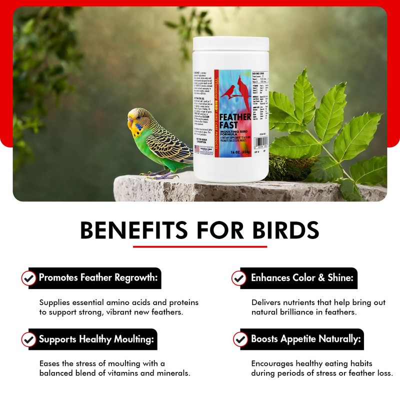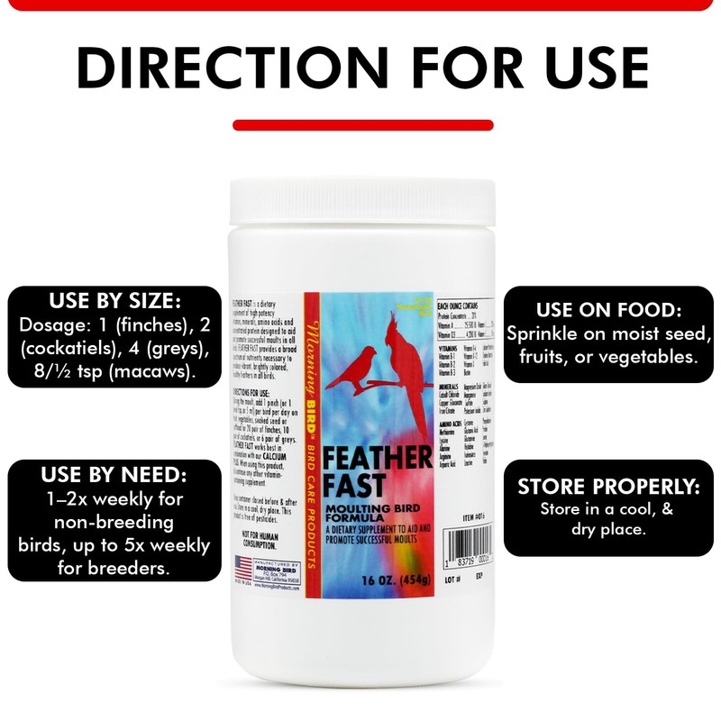 Morning Bird Feather Fast 16 Oz – Multi-Vitamin During Molt - Molting Support Supplement for Bird – Amino Acid & Vitamin Powder Formula– Promotes Feather Growth, and Full Plumage – for All Adult Birds