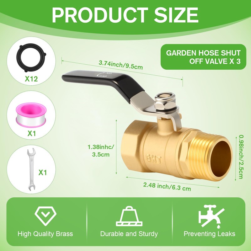 - Wide Compatibility: our packing including garden hose shut off valve x 3, black washers x12, thread sealing tape x 1, wrench x 1, sufficient quantity to meet your needs; The design 3/4'' GHT male thread to 3/4'' GHT female thread which is compatible with most of the USA standard garden, hoses, nozzle, garden connector, etc