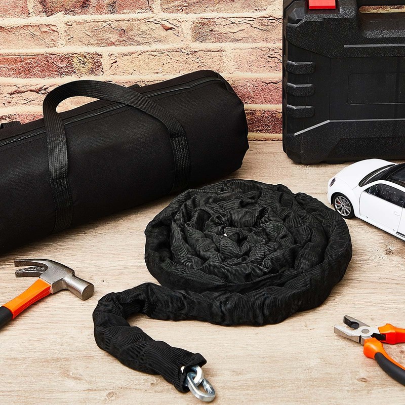 - Hefty Alloy Steel Chain: each chain link boasts thickness about of 5/16 inches, reaching up to 10 foot in length, and a hardness value about of 750±100HV; This package only includes a hefty motorcycle lock chain and a storage bag