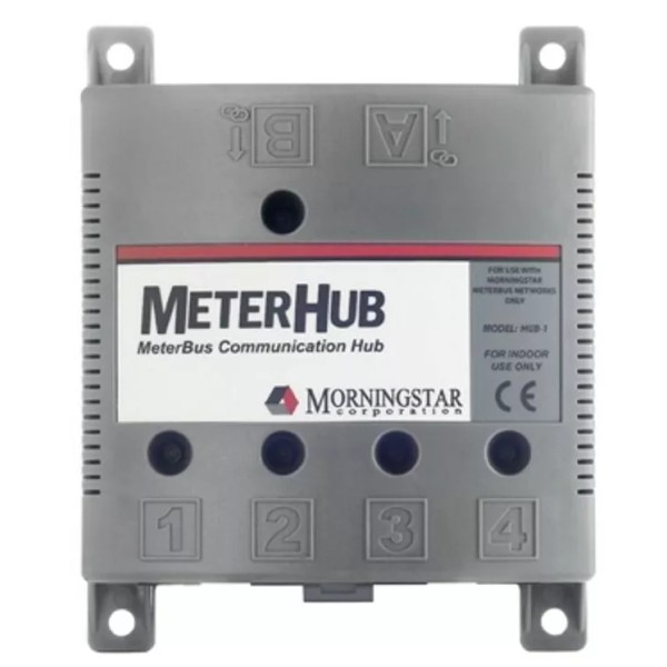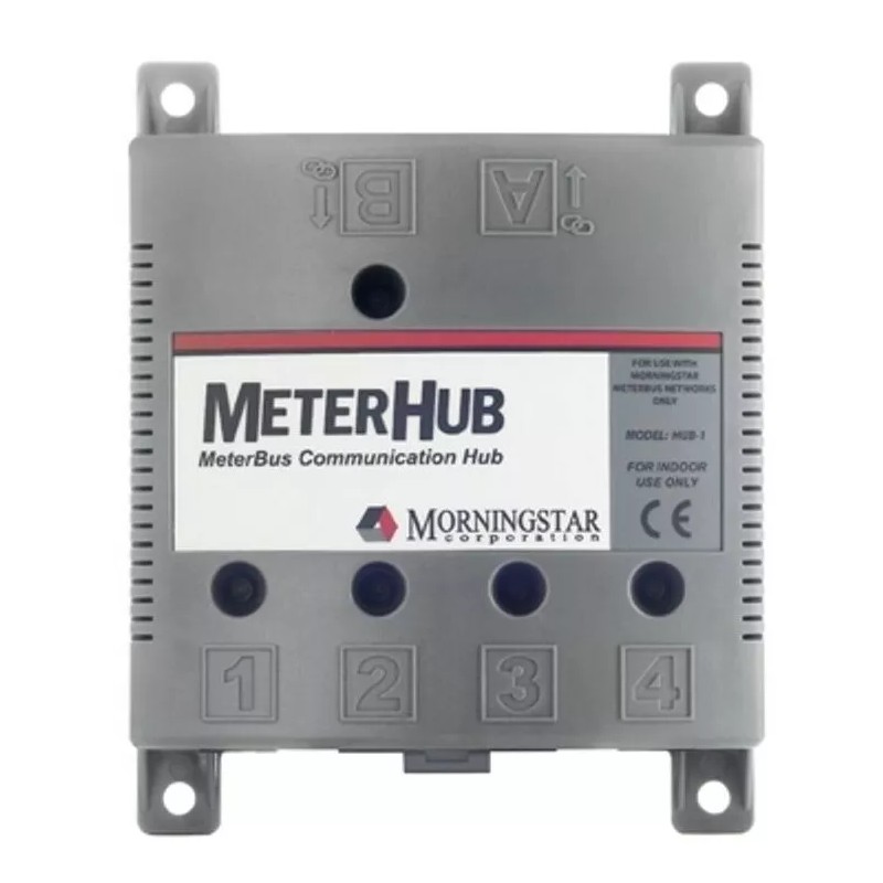 Morningstar's MeterHub (HUB-1) allows multiple Morningstar products to communicate over a Meterbus netword to provide improved data monitoring, additional capabilities and lower system cost.
