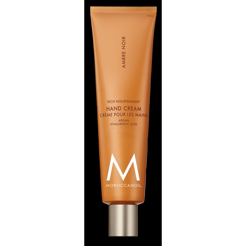 Moroccanoil Hand Cream Ambre Noir 100ml intensely nourishes hands, nails, and cuticles with a rich yet fast-absorbing moisturizer featuring antioxidant-rich argan oil, hyaluronic acid to attract and lock in moisture, squalane to help soften and smooth skin, and a blend of cocoa and shea butters to help increase moisture and strengthen the skin barrier.