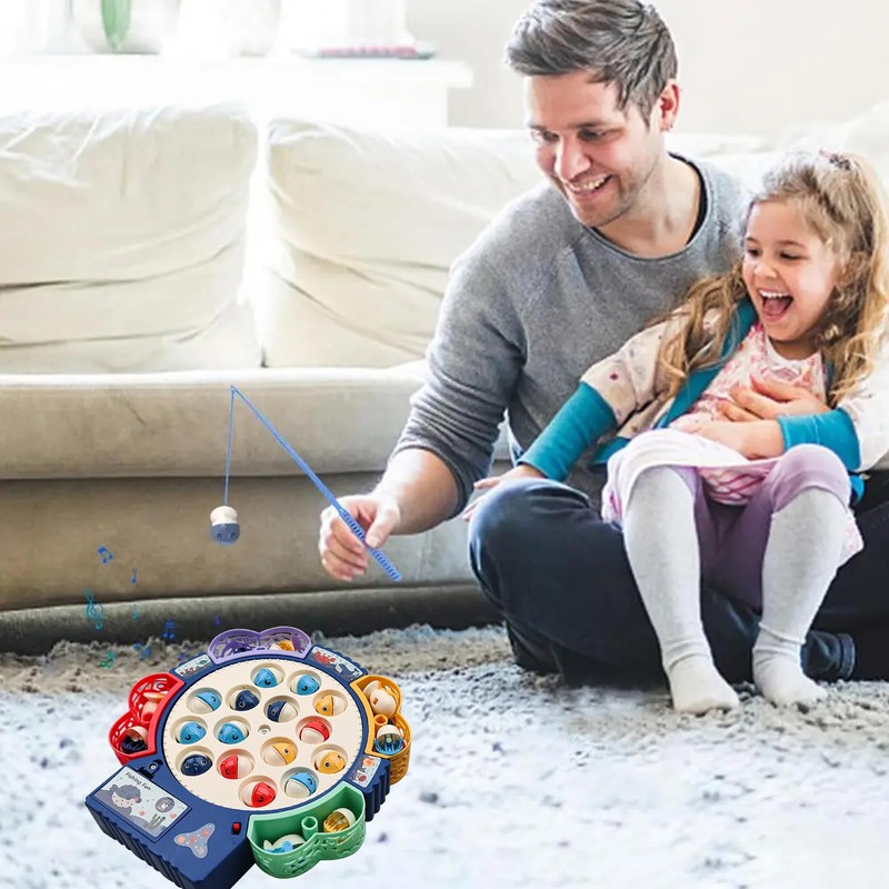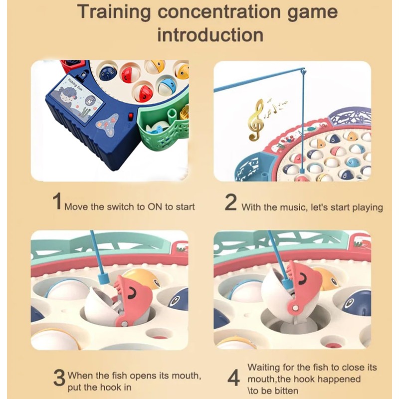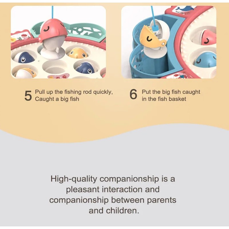 • Package includes: Motorized spinning game board with 4 detachable fish boxes in 4 different colors, 25 fish, 4 non-magnetic fishing and 4 magnetic fishing. With music