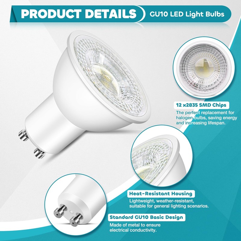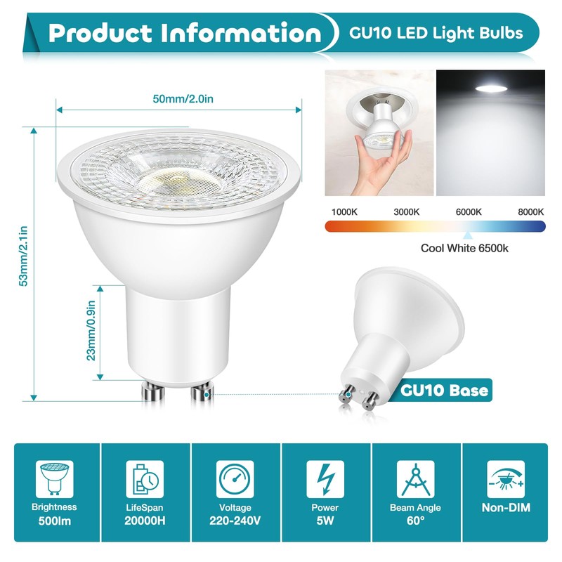 - Higher Efficiency GU10 LED Spotlight Bulbs:Each 5W bulb delivers 500lm brightness,these GU10 bulbs replace traditional 50W equivalents.longer lifespan up to 20,000 Hours, reducing replacement costs.