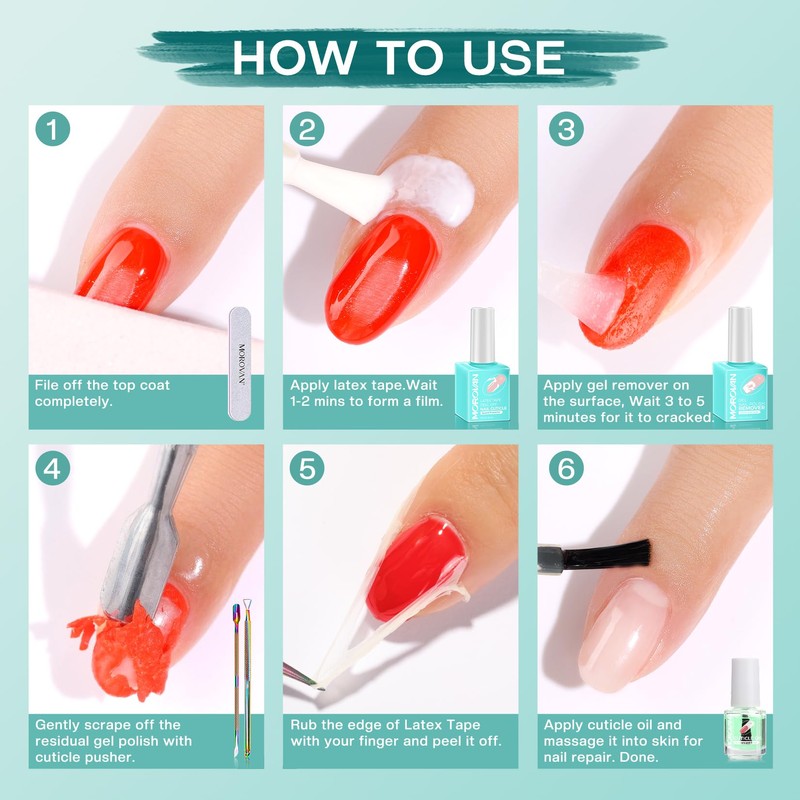 - MOROVAN GEL NAIL POLISH REMOVER KIT: Included In this gel nail polish remover kit, gel nail polish remover, peel-off latex tape barrier liquid, cuticle pusher trimmer peeler, cuticle oil, nail file and nail cleaner pads.