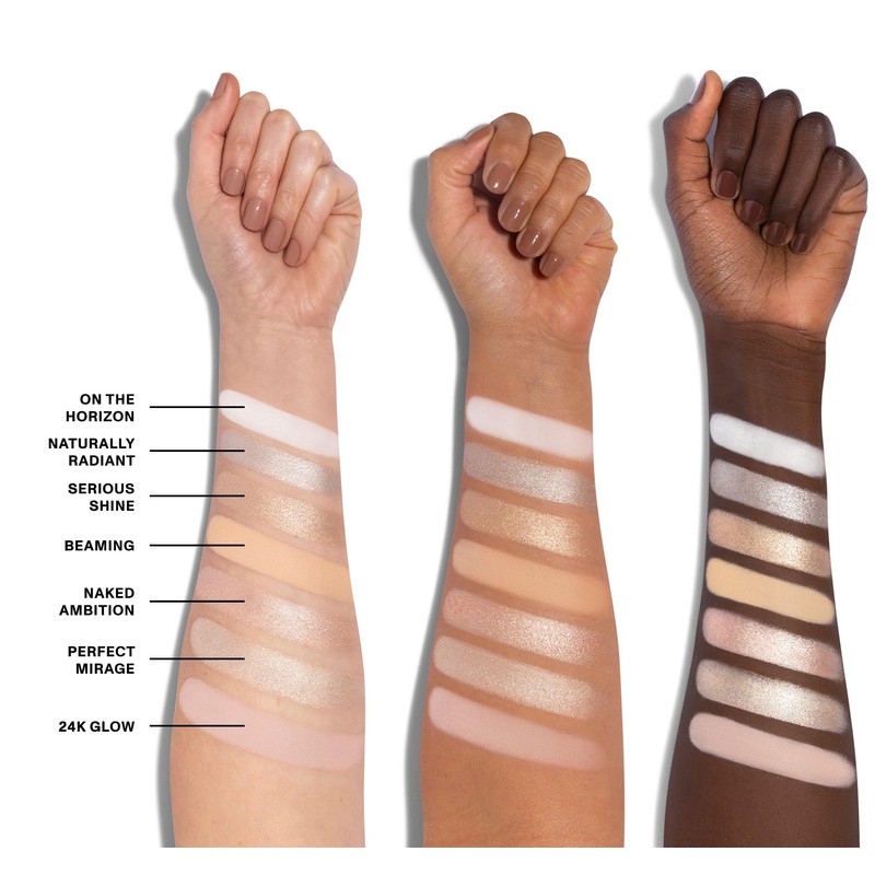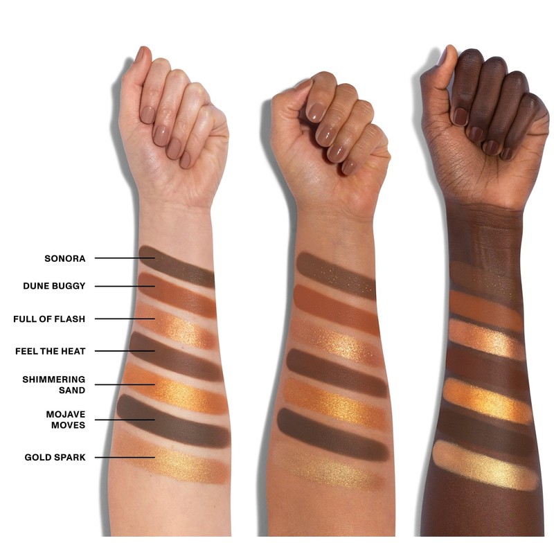 - DESCRIPTION|INGREDIENTS| Row 1: Sun Seeker (matte rich cocoa) Lustrous Life (metallic smoke) In The Shade (matte cool brown) Wild Encore (shimmer purple brown) Look This Way (shimmer chocolate bronze) Kalahari (matte rich brown) Sahara Nights (matte black)| Row 2: In The Deep (matte brick) Blazing Heat (metallic copper) Dawn To Dusk (matte terra-cotta) Terra Firma* (shimmer apple) Molten (matte maroon) Just Watch (metallic sangria) Cocoa Dust (matte cinnamon)| Row 3: Sonora (matte tan with gold pearl) Dune Buggy (matte marmalade) Full Of Flash* (metallic bronze) Feel The Heat (matte saddle) Shimmering Sand (metallic bright gold) Mojave Moves (matte coffee) Gold Spark (shimmering green/gold)| Row 4: In The Dust (matte tan) Sunday Sunrise (shimmering champagne) Bare It All (matte pale dandelion) Bronzed And Buffed (matte almond with gold pearl) Getting Warmer (matte nutmeg) Solar Power (matte cool brown with gold pearl) Sand Storm (matte cool taupe)| Row 5: On The Horizon (matte white) Naturally Radiant (shimmering cool taupe) Serious Shine (shimmer pearl) Beaming (matte beige) Naked Ambition (shimmer pink champagne) Perfect Mirage (shimmer chai) 24k Glow (matte pink beige)