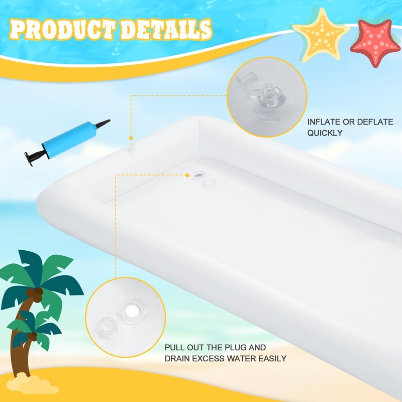 - Useful - Set of 4 pcs Inflatable Serving Bar, enough amount for you to arrange a joyful and remarkable party. MorTime Ice Serving Bar is roomy enough to hold multiple bowls, dishes, drinks and cans. You can fill it with ice to keep food and drink cool and fresh for hours and enjoy your party. The size is 52.8 x 25.2x3.9 inches.
