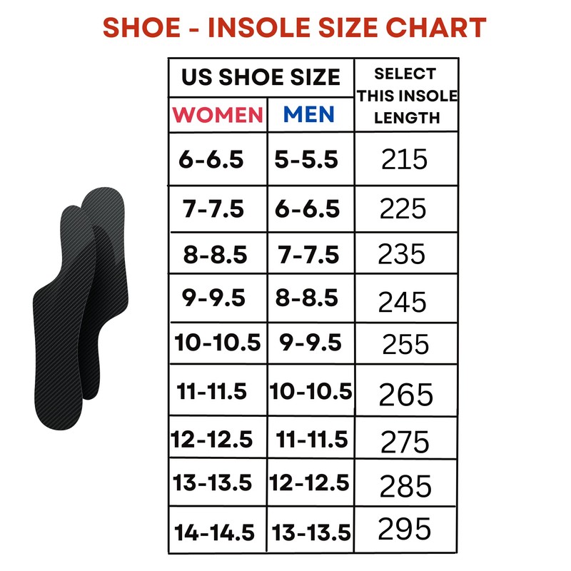 - →EXACT MATCH: Please do not measure your foot length or original insoles of your shoes. The size chart is for the shoe size! Select your insole length according to your shoe size from the second picture. Don’t worry! They will fit perfectly. We have solved the mismatched shoe size and insole length issue mentioned in other stores. Please use this carbon fiber insert below your original removable shoe insole or under orthotic.