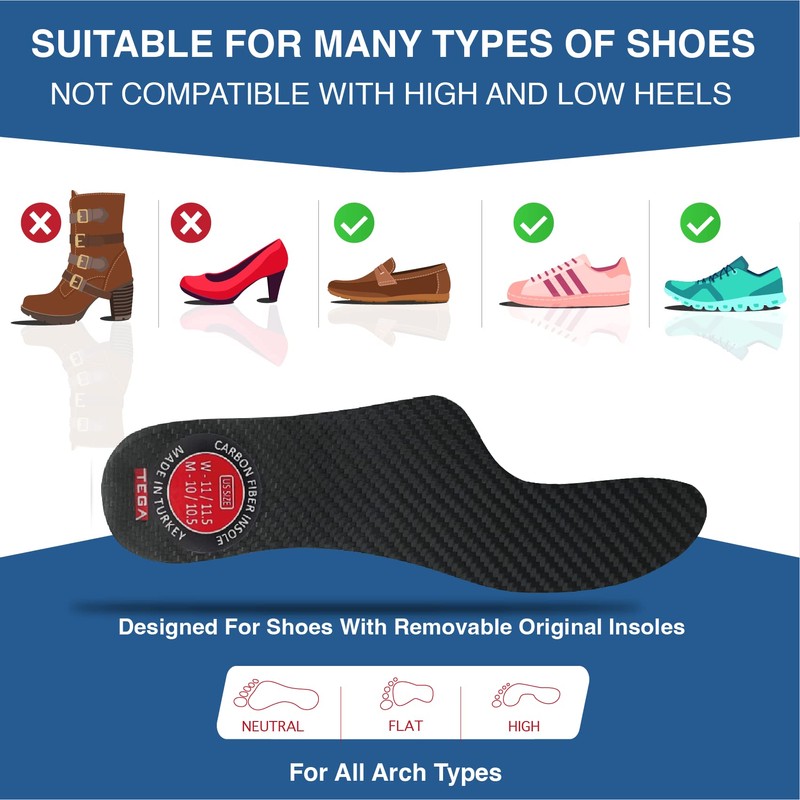 - →SOLD AS A PAIR: This VERY RIGID carbon fiber insoles are sold as a PAIR, not a Single Piece. You will find it as a single piece at other stores and if you are going to use it for both feet, you will need to buy two from their stores. The second picture shows the size chart of the insoles (mm). They are suitable for sports and sneakers shoes, not for high and low heels or dress shoes. Please consult your doctor to ensure these insoles are the right product for you.