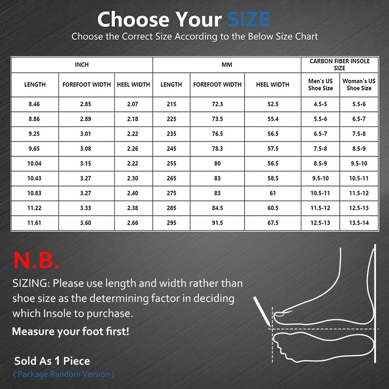 - 【Pain Relief】: The carbon fiber insole is 1.5 mm thick with little flexibility designed to relieve the pressure between the metatarsal joints and toes, to keep your toes from over-extending, reducing pain from too much movement for a better gait and balance. Easy to use. Carbon fiber insert can be used in different sports shoes such as sneakers, hiking boots, baseball, tennis, golf, soccer or basketball shoes.