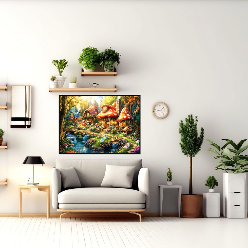 - Premium Material: The fantasy mushroom cottage jigsaw puzzle is made of high quality recycled cardboard, sturdy and bend-resistant. Special surface film treatment, color remains freshness after long time storage. Finished Size: 27.56" x 19.69"