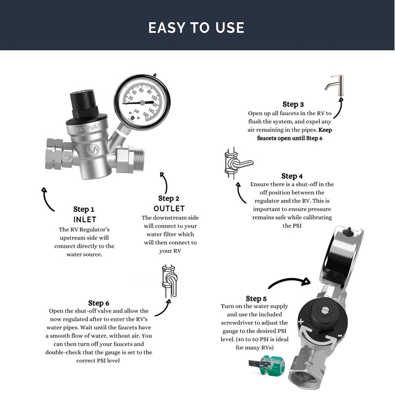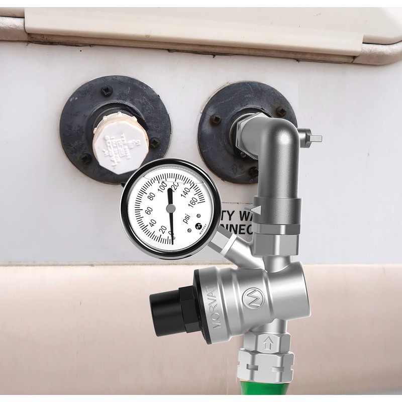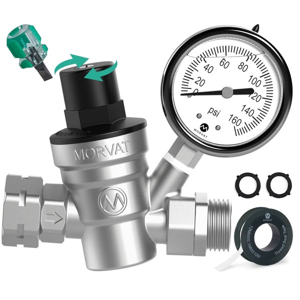 Morvat Premium Lead-Free Brass RV Water Pressure Regulator Adjustable Valve with Oil Filled Gauge for Camper, Includes Screwdriver, Roll Of Teflon Tape & 2 Extra Rubber Washers