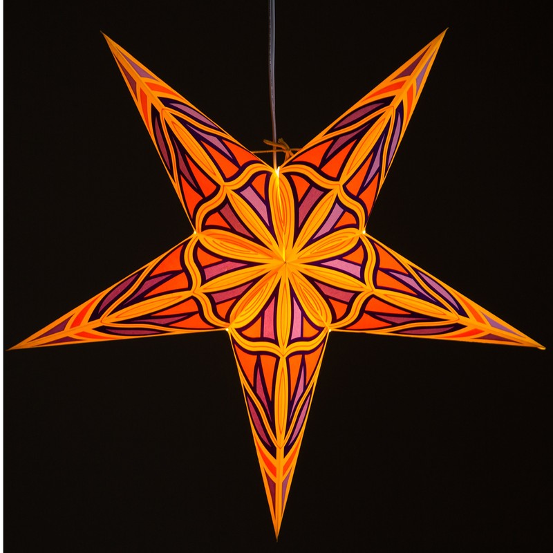 - This Paper Star Light features a yellow background with orange and magenta cutouts that shine through to create a stained glass effect