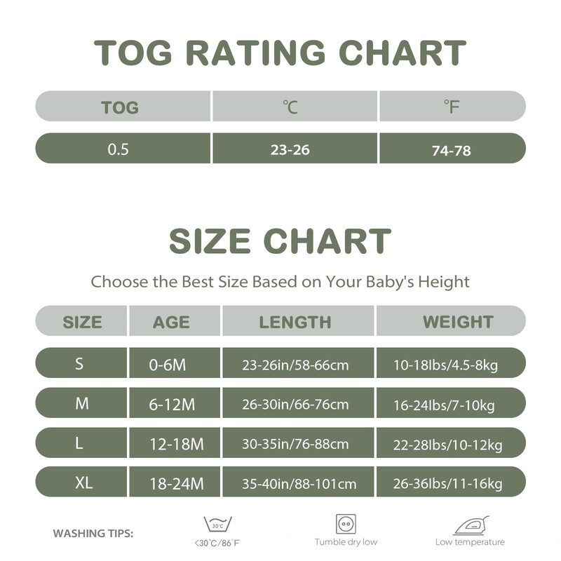 - 【Size】Please select the appropriate size based on the baby's height. The27 in/0-6 months baby sleep sack is suitable for babies with a height of 23-26 in. The 30 in/6-12 months size fits babies measuring 26-30 in. The 34 in/12-18 months baby sleeping bag is designed for babies with a height of 30-35 in. The 38 in/18-24 months length accommodates babies measuring 35-40 in in height.