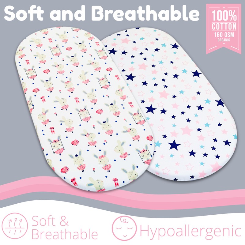 - 👍100% COTTON FITTED MOSES BASKET SHEETS – our Moses basket sheets are approved by mums as they are hypoallergenic and super gentle against your baby’s skin. Made from soft, breathable, 160GSM Cotton, these fitted Moses Basket sheets fit snugly around the mattress for your baby’s comfort and safety.