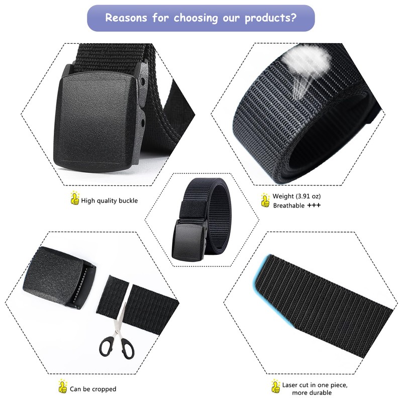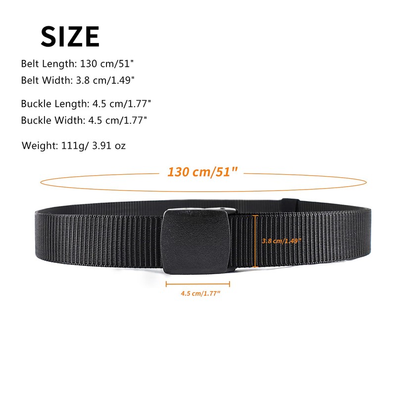 - 【Perfect fit & Non-Slip】Nylon canvas belt mens without holes. Therefore, the tightness and length can be freely adjusted. To meet a variety of different wearing and needs. Very simple and convenient. Everyone can use it. You just put the webbing through the buckle and adjust to the perfect fit. If you want to unstrap, just push the trigger and pull the webbing out.