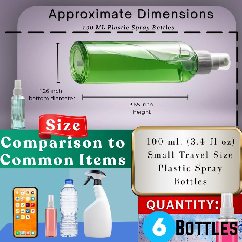 MOSINCO 6 Pack - Small Travel Size Clear Empty Plastic Spray Bottles w/Fine Mist Sprayer - 100ml - 3.4 oz - Reusable-Multipurpose