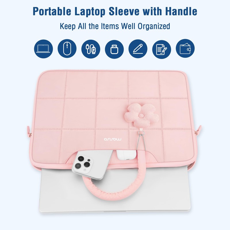 - Comfortable padded handle, this laptop sleeve is lightweight and stylish, making it the perfect accessory for young women going out. It's a perfect companion for work, travel and leisure, without adding any extra weight. This computer bag features a stylish rectangle quilted and a detachable elegant flower pendant, seamlessly combining fashion and functionality.