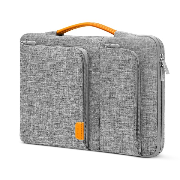 - 360 degree all around protective reinforced interior edge briefcase carrying case bag protect your laptop from any accidental dropping. Extendable handle design makes it to carry your laptop around in comfort, you can also tuck away the handle. Side opening zipper design, avoid accidental dropping of your laptop while carrying. 2 front "L" zipper pockets provide enough space to keep mouse, earphone, pens and notepads, offering added convenience.